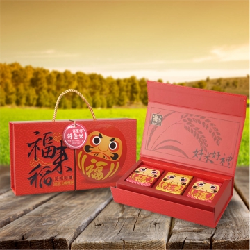 米在華人世界有著米滿、祈福、招財之意,配上家喻戶曉的吉祥物不倒翁的意象,希望收到米禮的親友享受頂級米食之外也能事事順心如意。